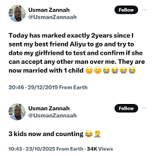 The story began back in 2017, when Usman Zannah revealed on social media that he asked his best friend Aliyu to “go test” his then-girlfriend’s faithfulness. The aim? See if she would stay loyal or switch sides.